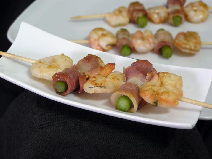 Planteamos una nueva manera de degustar unos langostinos marmeronenses. Unas brochetas de langostinos con un peculiar acompañamiento: espárragos verdes enrollados en tocino.