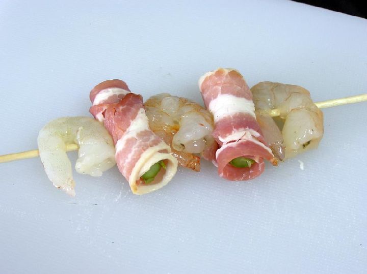En las brochetas alternaremos langostinos con enrollados de espárrago y sólo nos quedará asarlas en una sartén o asadora, con apenas un chorrito de aceite, no olvidemos que el tocino soltará enseguida bastante grasa y que es de por sí un producto salado. No es conveniente asar durante mucho tiempo el marisco porque tiende a quedarse seco pronto, hay que tener en cuenta que aquí lo utilizamos ya pelado.