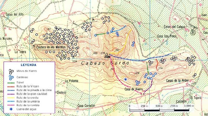 Esta ruta parte de la cara sur y asciende por los antiguos caminos mineros, que eran utilizados para el transporte del mineral a lomos de burros y mulas. En las terreras donde se depositaban los restos de rocas y minerales no útiles podemos observar interesantes mineralizaciones de calcita y magnetita, principalmente. En la parte superior se encuentra la mayor cavidad originada por las actividades de laboreo del mineral de hierro a finales del siglo XIX. Este lugar es frecuentado por diversas especies de aves como los gorriones chillones, las lechuzas o las collalbas negras.