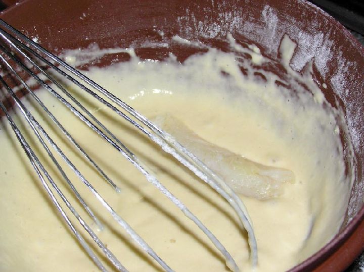 Desalado el bacalao, y cortado en trozos, sólo queda preparar la masa de buñuelo dónde lo rebozaremos. Batiremos primero el huevo, pondremos una pizca de sal y añadiremos el elemento líquido que, en este caso y por ser una receta salada, puede ser un poco de cerveza pilsen.