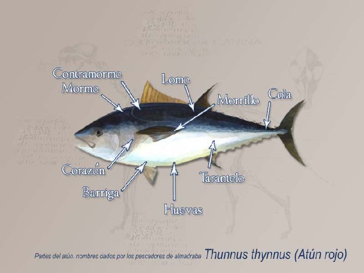El atún o Thunnus thuynnus, conocido como atún rojo o cimarrón, pertenece a la familia de los Escómbridos y posee un cuerpo fuerte, fusiforme (en forma de huso), con la cabeza grande y triangular, así como una boca pequeña en comparación con su cráneo. Las escamas que cubren su piel son pequeñas y lisas, si bien se encuentran lubricadas con una sustancia que reduce la fricción del agua, lo que le permite nadar a velocidades que superan los 70 Km/h.