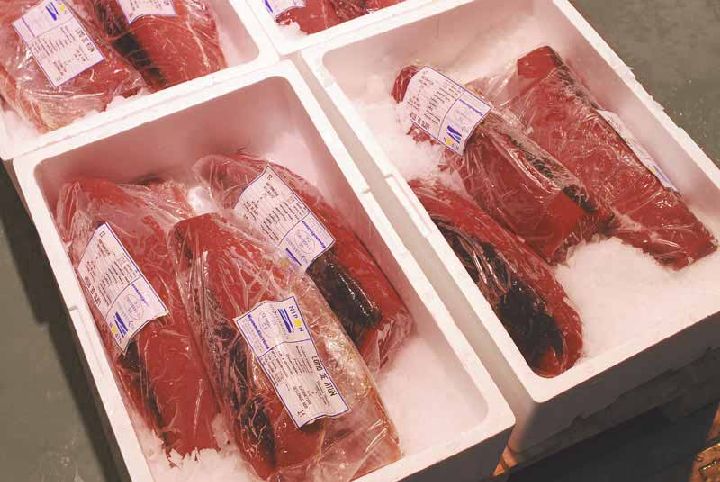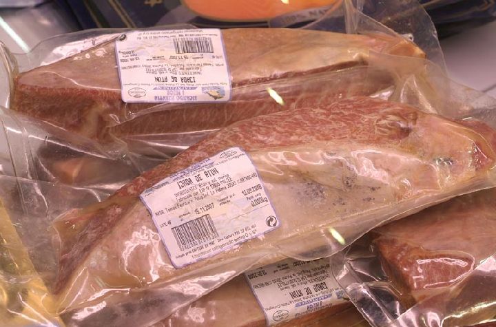 Atún de ojos grandes o patudo. De cuerpo particularmente redondeado, puede llegar a pesar 200 Kg. Es un pez tropical que abunda en aguas del Océano Pacífico.