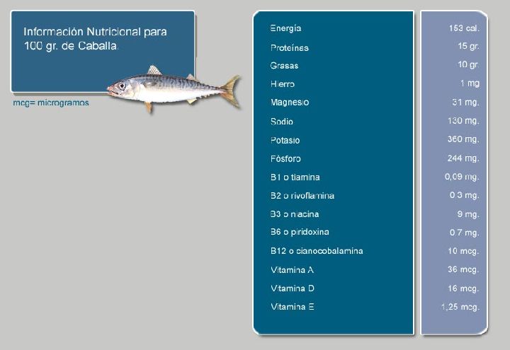 La caballa es uno de los llamados pescados azules entre los que se encuentra además el atún. Su contenido graso es elevado, de cada 100 gramos posee 10 de grasa, no obstante se trata de una carne rica en ácidos grasos omega-3, que facilitan la disminución de colesterol y triglicéridos en la sangre, proporcionándole mayor fluidez y previniendo de esta forma los coágulos o trombos. A su vez reducen el riesgo de padecer enfermedades coronarias resultando un pescado rico en proteínas, vitaminas y minerales.