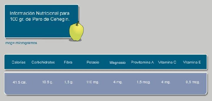 Al igual que ocurre con las demás frutas, el Pero de Cehegín o de Alcuza está compuesto en su mayor parte por agua (más de un 85%) por lo que su consumo resulta refrescante e hidratante. Sus nutrientes más destacados son los azúcares (fructosa en mayor proporción, glucosa y sacarosa) de rápida absorción por el organismo. Se trata de un alimento rico en fibra, vitaminas y minerales.