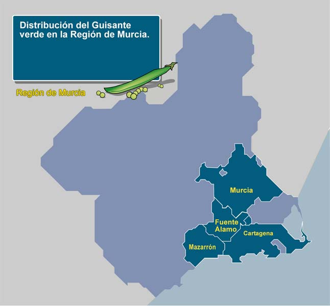 Actualmente la Región de Murcia cuenta con una producción cercana a las 1.300 toneladas de guisante al año, repartidas entre el Campo de Cartagena (principalmente Cartagena y Fuente Álamo), Huerta de Murcia y Mazarrón. Pero este cultivo se encuentra en constante crecimiento, alcanzando de nuevo cifras cercanas a las 1.500 toneladas recolectadas en 2000.