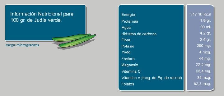 Las judías verdes están compuestas en su mayor parte de agua (90% por lo que es un potente diurético y depurativo del organismo), hidratos de carbono, fibra, proteínas, así como unos valores muy bajos de lípidos o calorías y ninguna grasa, resultando aconsejadas como alimento por expertos en el campo de la nutrición para dietas de regulación o pérdida de peso.