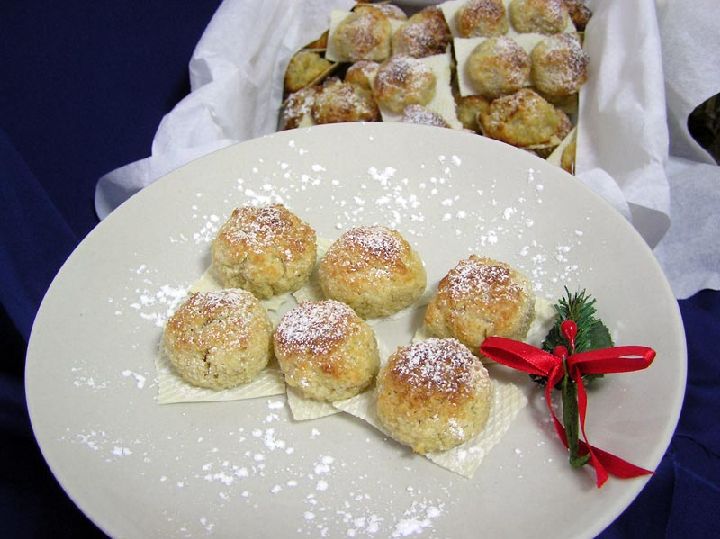 Con la masa resultante se moldearán unas bolitas que dispondremos sobre unas obleas, horneándolas a 180º hasta que queden doradas, entonces se espolvoreará azúcar sobre nuestros dulces.