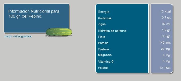 Los pepinos, al igual que otras verduras y hortalizas, presenta un elevado nivel de agua en su composición, cercano al 90%, así como bajos aportes calóricos por su escaso contenido en hidratos de carbono, por lo que resulta un alimento ideal en dietas que regulan el peso, combinando con numerosas verduras en la elaboración de frescas ensaladas veraniegas.