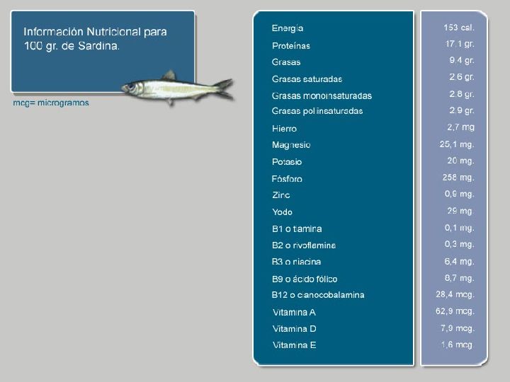 La sardina, al igual que la práctica totalidad de los pescados azules, muestra un alto contenido graso, casi 10 g de grasa cada 100 g de porción comestible, no obstante es una buena fuente de ácidos grasos omega-3 por lo que actúa en la reducción de los niveles de colesterol y triglicéridos en la sangre, haciéndola más fluida y reduciendo el riesgo de padecer arteriosclerosis o trombosis. Debido a esto los expertos en nutrición recomiendan consumirlas a las personas que padecen enfermedades cardiovasculares.
