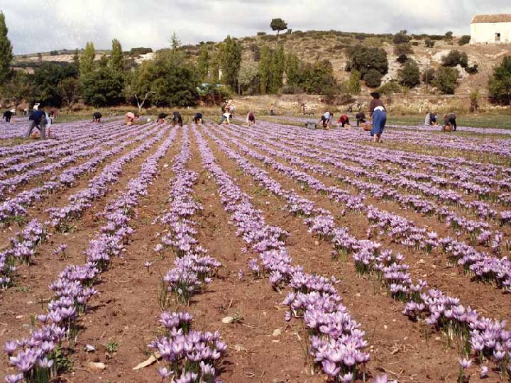 El cultivo de azafrán en España fue introducido probablemente por los musulmanes durante los años de dominación de la Península ibérica en la Edad Media (VIII al XV), al igual que ocurrió con otros productos considerados como exóticos y desconocidos hasta esas fechas en la zona. De hecho su nombre parece provenir de la palabra islámica zahafarn, que a su vez deriva del persa safra o amarillo.