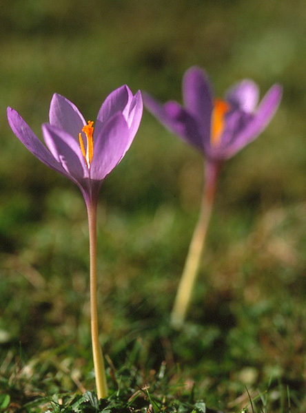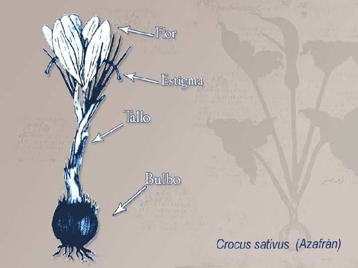 El azafrán o Crocus sativus procede de la planta del mismo nombre perteneciente a la familia de las iridáceas. Morfológicamente muestra rizoma en forma de tubérculo, hojas lineales, perigonio de tres divisiones externas y tres internas algo menores, tres estambres, ovario triangular, estilo filiforme, estigma de color anaranjado, dividido en tres partes colgantes y caja membranosa con muchas semillas. Los estigmas contienen un aceite volátil de sabor agradable y colorante amarillo muy intenso.