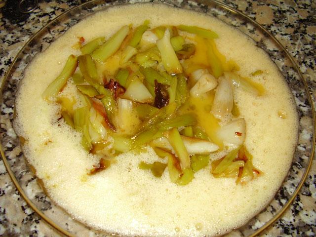 Momento ahora de batir los huevos, sazonar, verter los ajos sin el aceite y mezclar con cuidado de no romperlos.