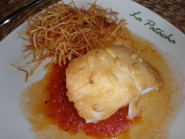 EL plato es un trozo lomo de bacalao con una salsa bechamel con un ligero toque de ajo. Pero según su jefe de cocina, Jose Luís Santiago, el contrapunto lo pone la base de tomate confitado que tuvo el acierto de poner. También lleva unos piñones por encima y como guarnición unas patatas paja.
