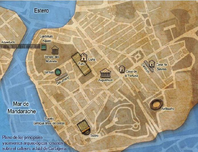 El urbanismo de Carthago Nova estuvo siempre condicionado por una topografía peculiar dominada por tres elementos principales: península, puerto y colinas.