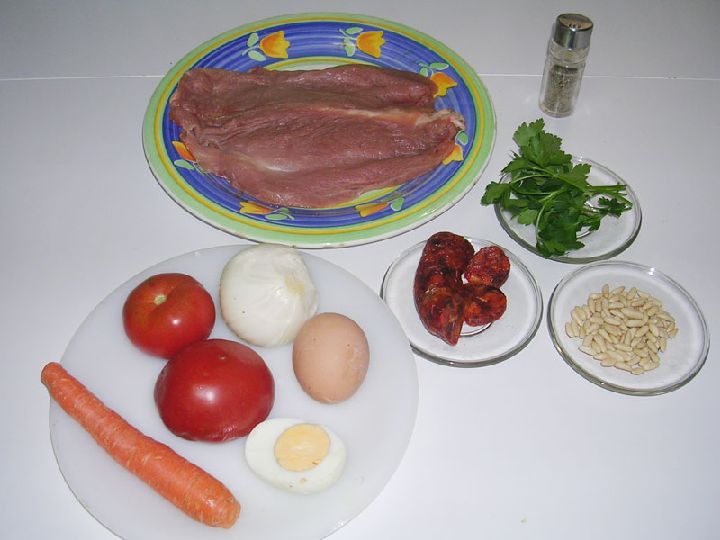 Cortamos el chorizo y el huevo en trocitos de tamaño similar, preparamos el perejil, el ajo laminado y los piñones. Ahora colocamos todo esto bien repartido a lo largo de la carne.