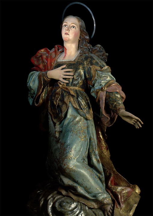De tamaño bastante menor al natural, se representa la Santa en su forma tradicional con palma y plato que contiene otros ojos, las manos son de bella factura y lleva a sus pies dos graciosos angelitos.
