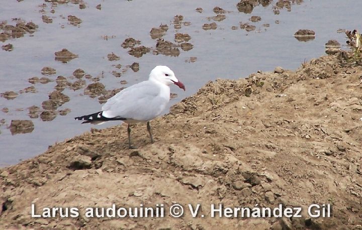 La Gaviota de Audouin es una gaviota de tamaño medio, esbelta, lo que se ve acentuado por el suave perfil de su frente. De su coloración, lo más característico es el pico, de color rojo coral con el extremo de color negro, manchado de amarillo en la punta.