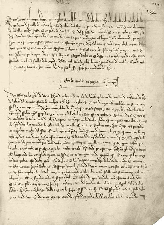 Sepan quantos esta carta vieren como yo Alfonso Pérez, despensero mayor de Don Juan, fijo del Infante Don Manuel, por mi e por los mios doy e otorgo cierta parte de frutos a bien labrar e mejorar e labrar e no peorar segund fue acostumbrado de buenos labradores, a vos Juan Pelegrin e Miguel Agrás e Domingo Sanchez e Domingo de Aldea e Juan Gomes e Domingo de la Torre e Pascual de Riopal e Sancho Perez e Juan Domínguez e Martin de Velez e Alfonso de Leños e Martin Dominguez e Esteban Martin Dalliña e Miguel de Sarrión e Balero Lopez e Juan de Alcaraz e Juan Lopez e Esteban Garcia e Remon de Montalto e Domingo Gomes e Sancho de Navas e Bernald Esteban e Pero Esteban e Juan Pedro Peres e Juan de la Peña, ...