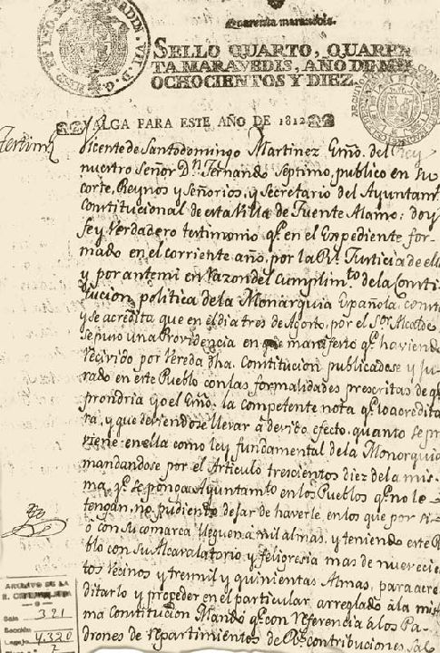 Testimonio (al margen). Vicente de Santodomingo Martínez, Escribano del Rey nuestro señor Don Fernándo Séptimo, público en su Corte, Reinos y Señoríos, y Secretario del Ayuntamiento Constitucional de esta Villa de Fuente Álamo, doy fe y verdadero testimonio que en el Expediente formado en el corriente año por la Real Justicia de ella y por ante mi en razón del cumplimiento de la Constitución política de la Monarquía Española, consta y se acredita que en el día tres de agosto, por el Señor Alcalde se puso una Providencia en que manifestó que haviendo recivido por vereda dicha Constitución, publicádose y jurado en este Pueblo con las formalidades prescritas de que pondría yo el Escribano la competente nota que lo acreditara, y que deviéndose llevar a devido efecto cuanto se proviene en ella como ley fundamental de la Monarquía, mandándose por el artículo trescientos diez de la misma que se ponga Ayuntamiento en los Pueblos que no le tengan, no pudiendo dejar de haverle en los que por si o con su comarca lleguen a mil almas, y teniendo más de nuevecientos vecinos y tres mil y quinientas almas, ...
