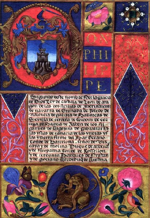 Don Philippe Segundo de este nombre, por la gracia de Dios rey de Castilla, de León, de Aragón, de las dos Sicilias, de Jherusalem, de Navarra, de Granada, de Toledo, de Valencia, de Galizia, de Mallorcas, de Sevilla, de Cerdeña, de Córdova, de Córcega, de Murcia, de Jahen, de los Algarues, de Algezira, de Gibraltar, de las yslas de Canaria, de las Yndias, yslas y tierra firme del mar océano, conde de Barcelona, señor de Vizcaya y de Molina, duque de Athenas y de Neopatria, conde de Rossellón y de Cerdania, marqués de Oristán y de Gociano, archiduque de Austria, duque de Borgoña, de Bravante y de Milán, conde de Flandes y de Tirol, etc.