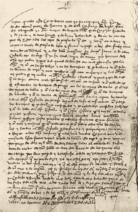 E porque vos, Mofarix, sedes vezino e morador en Montiel e la paga desta compra fizistes a mí, dicho Per Enrríquez, en Alcaraz, otorgo que sean firmes e valederas todas quantas cosas sobredichas son en esta carta e cada una dellas e vos ayudedes vos e los vuestros de todas cunplidamente, y por mayor guarda y firmedumbre esta compra deste castiello de Priego determinado e amoxonado segun que suso es dicho, robrevos la dicha conpra en Alcaraz, a la colación de San Miguel, domingo sallida misa mayor, como fuero de Alcaraz manda, y desto son testigos rogados y llamados por amas las partes Gonzalo Alffon, y Per Affan, y García Fernández de Villodre, y Blasco Ximénez, y Gutierre García, y Fernán Sánchez d'Estúñiga, y Johan Alfonso y Malmesto, alcaldes y Pero Pérez y Johan García, y Johan Barroso, y Martín Fernandez Gallego, y Bartolomé Martínez, y Pero Fernández Morales, y Miguel de Mula, Pero García, escriuano, y don Sánchez; y Pascual García, y Lorenço Pérez Gallego, y Pero Juan, clérigo, y Pero Ximénez, clérigo, y Lozano Pérez, Per Esteuan, y moros don Haçán Alcayat y Andallazis y Abrahan Ferrero, y don Muça y Hamete de don Salmeron, Alí el Romo, y Sancho Pérez y Fernández, escriuanos. Fecha domingo quatro días de abril, era de mill e treçientos e quarenta e tres años.