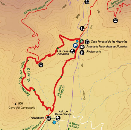 Este sendero local (marcas blancas y verdes), nos invita a disfrutar de la amalgama de valores naturales, paisajísticos e históricos que encierra este bello rincón de Sierra Espuña. Un cómodo paseo que parte junto al área recreativa y el aula de la naturaleza, asciende suavemente hasta el cruce con el PR-MU 61 (marcas blancas y amarillas) que sube al collado del Pilón (senda del Lentisco), desde donde divisaremos preciosas vistas del denso pinar del rincón de Alquerías. Entre coscojas, lentiscos y enebros, y la sombra itinerante del dosel de pino carrasco, descendemos por la umbría del Cabezo del Campanario siguiendo históricos trazados de valiosa mampostería.