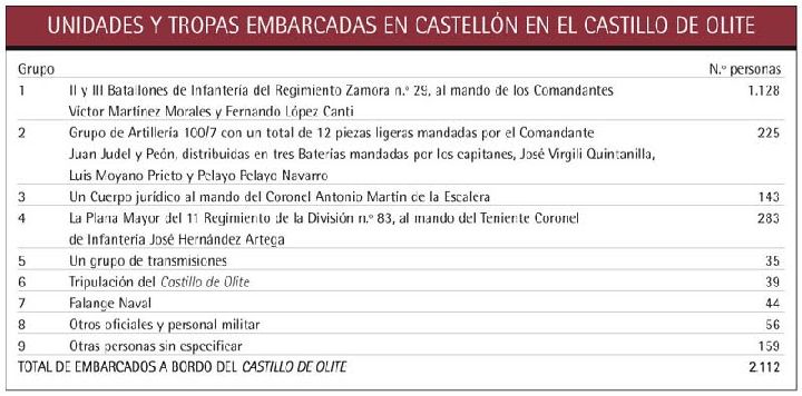 Cuando en la mañana del día 7 de marzo el Castillo de Olite enfiló la dársena del puerto de Cartagena, pocos de sus tripulantes podían imaginar lo que el destino les aguardaba minutos después, ajenos a su propia tragedia se sentían alegres e impacientes por desembarcar, la naturaleza de las tropas a bordo de este barco estaba formada por oficiales y tropas en su mayoría muy veteranas y que habían pasado por innumerables peligros pero hasta este momento conservaban lo más preciado, su vida.