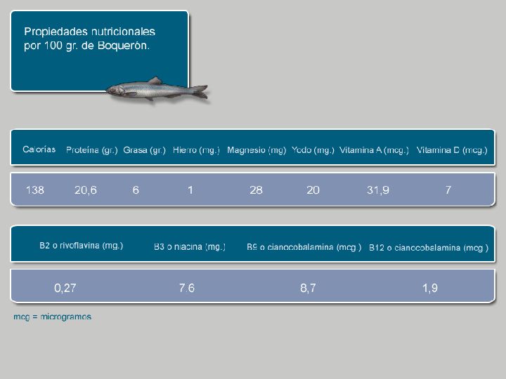 Son destacables además los aportes de calcio que proporciona el boquerón o la anchoa si se comen con espinas, proporcionando 10 gramos de esta especie el mismo calcio que un vaso de leche.