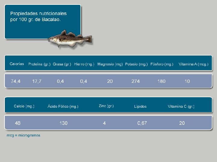 El bacalao salado contiene altos niveles de sodio, llegando incluso a los 89 miligramos por 100 gramos de porción comestible, debido al añadido de sal, empleada como conservante.