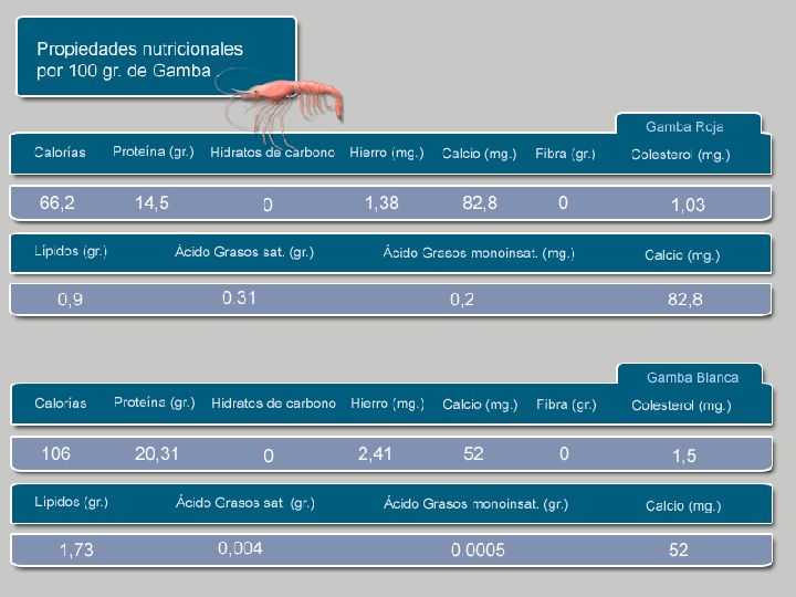 Las gambas son un alimento rico en proteínas, vitaminas y minerales, así como bajo en grasas. Los niveles proteínicos que se pueden encontrar en su organismo alcanzan los 21 gramos de cada 100 de porción comestible, su valor energético es muy bajo, apenas del 2 al 5% de grasa, proporcionando entre 65 y 105 calorías (dependiendo de la variedad) cada 100 gramos.