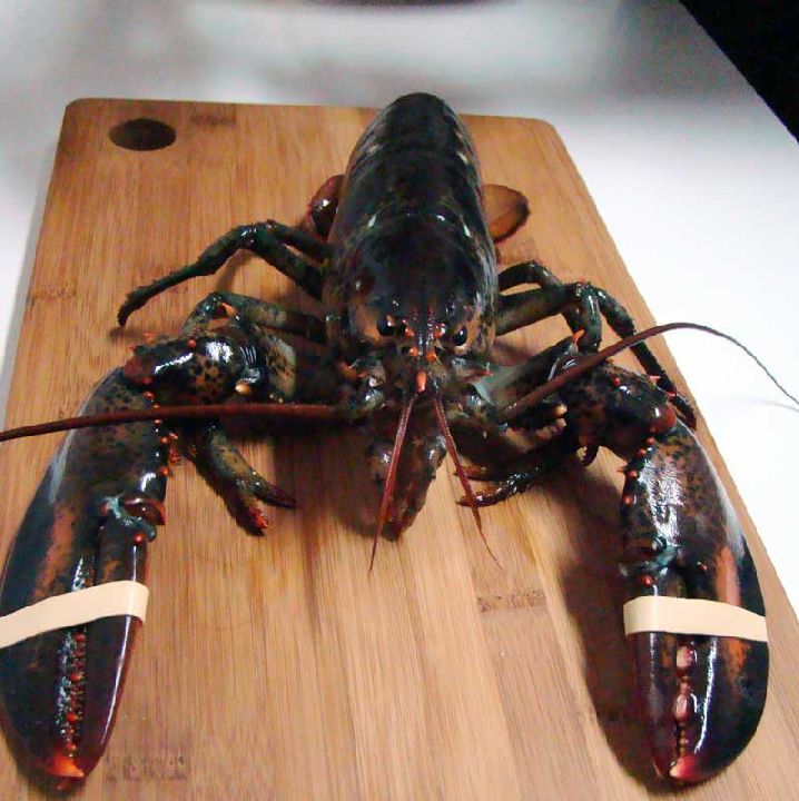 Bogavante europeo (Homarus vulgaris). Costas Atlánticas europeas. Tonalidades azuladas, incluso negras, con manchas claras. Tamaño mediano. Se trata de una variedad muy escasa.