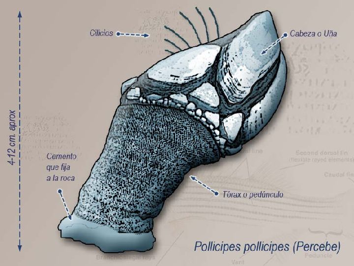 Se trata de una especie con una forma peculiar y presenta una particular relación con el medio en el que habita. Pertenece al grupo de los cirrípedos, del que existen cerca de 900 especies que crecen adheridas a rocas, conchas o corales (en este caso a una roca). Morfológicamente constan de dos partes claramente diferenciadas: inferior o pedúnculo y superior o cabeza (uña). El pedúnculo es una parte carnosa, cilíndrica, protegida por piel áspera y fuerte que, a través de uno de sus extremos, segrega una sustancia cementosa que, tras solidificarse, lo fija al sustrato donde habita. El extremo opuesto, o parte superior, acaba en una cabeza, uña o pezuña de varias placas. En conjunto puede medir de 4 a 12 centímetros, siendo el tamaño mínimo para su comercialización de 4-5 cm.