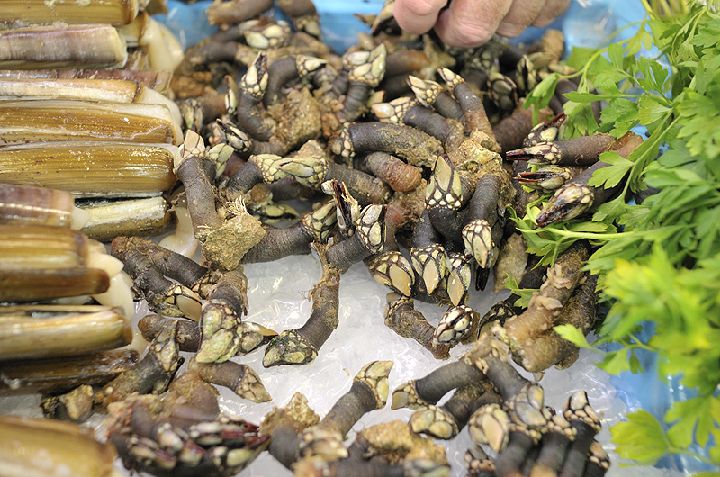 Percebe marroquí (Mitella pollicipes). Pertenece a la misma especie, pero su longitud es mayor y muestra una coloración más clara. Proviene de aguas cálidas, por lo que la textura y sabor de su carne son muy distintos a los del percebe gallego.
