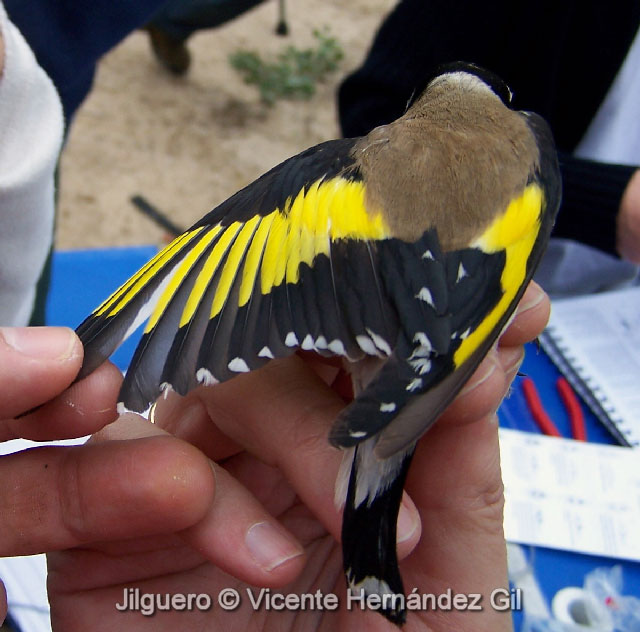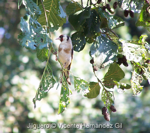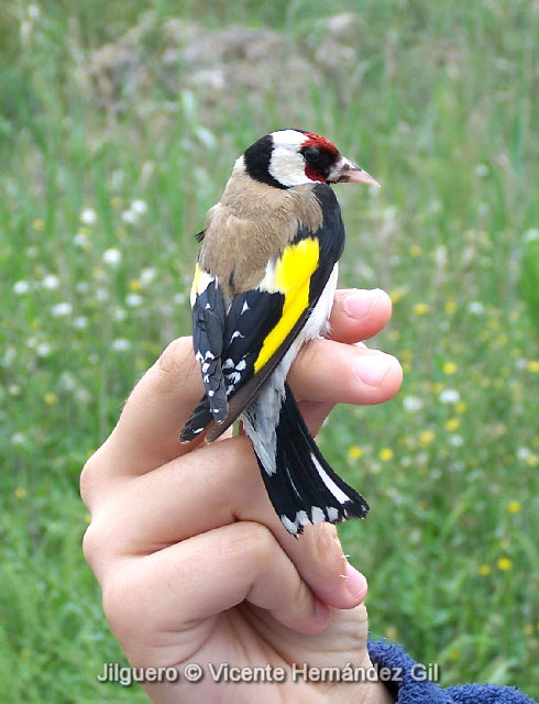 El Jilguero es un pájaro pequeño, de unos 12 cm. El color rojo, junto al blanco y el negro en la cabeza, y la llamativa franja amarilla en medio del negro de las alas, hace que a esta especie se le conozca también con el nombre de 'Colorín'. Otro de los nombres vernáculos utilizados para referirse a esta especie es el de 'Cavernera'.