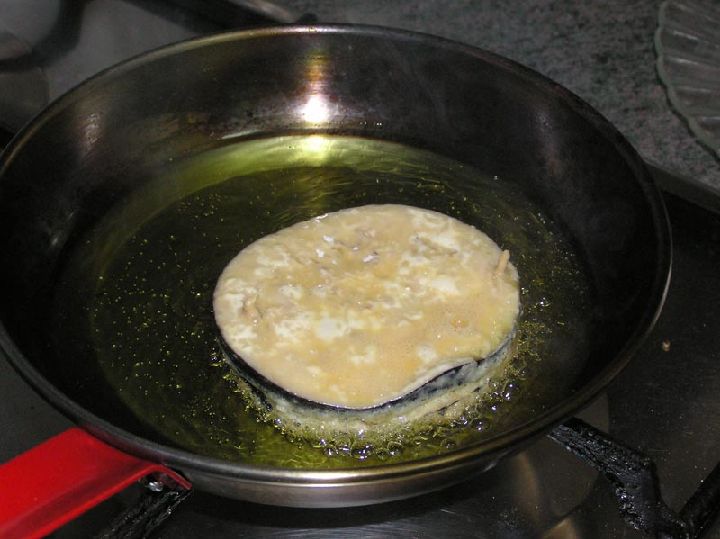 Pasamos las berenjenas, dispuestas como anteriormente se ha descrito, por harina y por huevo y finalmente se fríen en abundante aceite de oliva.