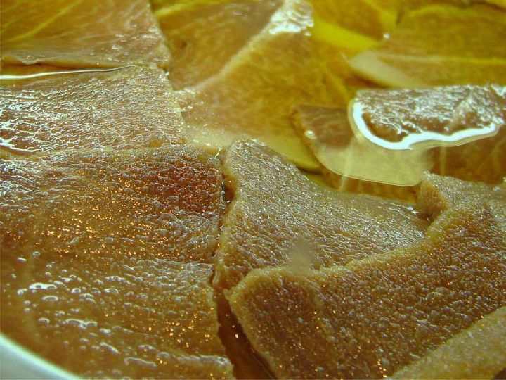 -Poned a cocer peras y quitadles el corazón, machacad con pimienta, comino, miel, vino de pasas, garum y un poco de aceite. Añadid huevos para hacer una patina, espolvoread con pimienta y servid.