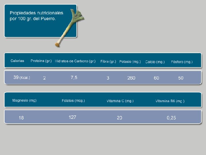 Al igual que ocurre con otras muchas verduras y hortalizas, el agua es el componente esencial y mayoritario del puerro, que posee además, niveles muy bajos de hidratos de carbono y calorías (en elaboraciones a la plancha, cocido o rehogado).