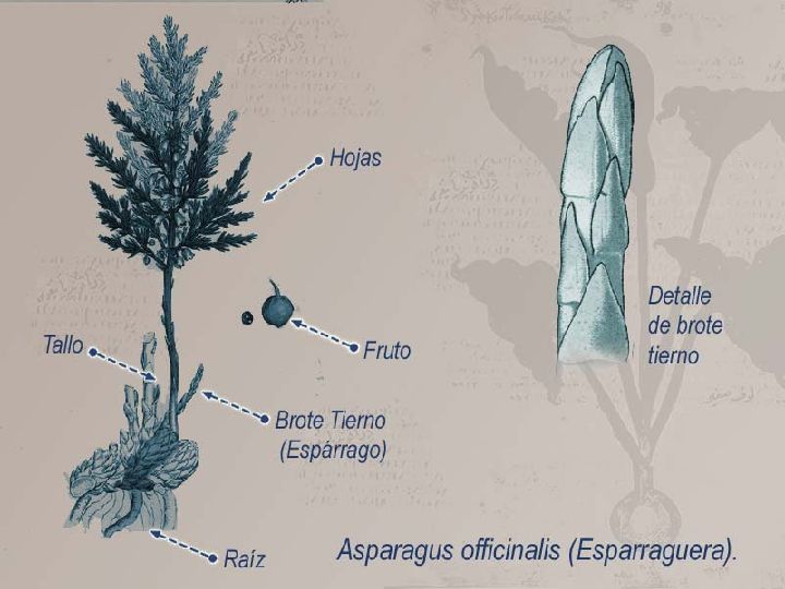 La esparraguera dispone de una parte subterránea conformada por raíces y yemas, así como otra aérea de tallos ramificados. Los espárragos son las yemas, brotes o turiones que, si se dejan vegetar, se transformarán posteriormente en nuevos tallos.
