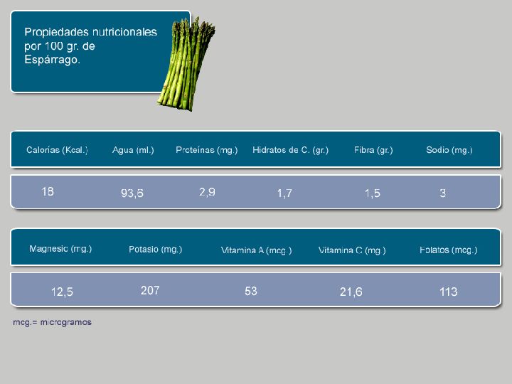 La sustancia con una presencia mayoritaria en los espárragos frescos es el agua. Su contenido en grasa es ínfimo, contraponiéndose a altos índices de proteínas y fibra.