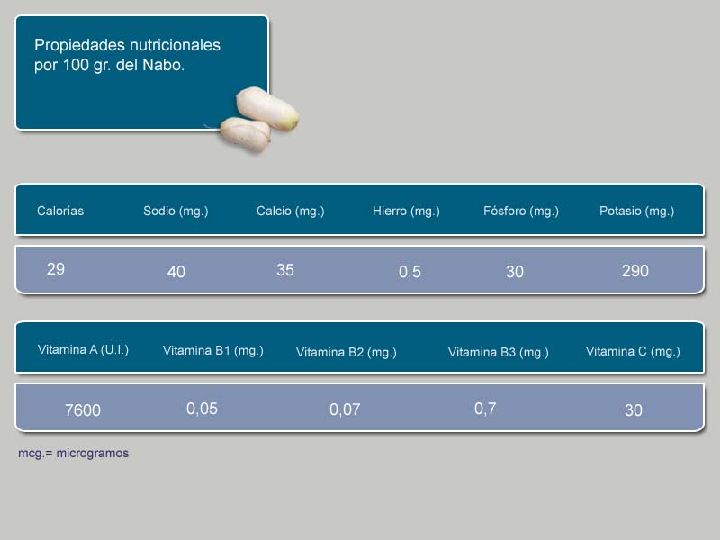 Las hojas del nabo contienen mayores índices de sustancias nutritivas que la raíz, aunque se consumen bastante menos en la Región de Murcia. Muestran el doble de proteínas y fibra, así como niveles más elevados de calcio. Además proporcionan beta-carotenos o protovitamina A.