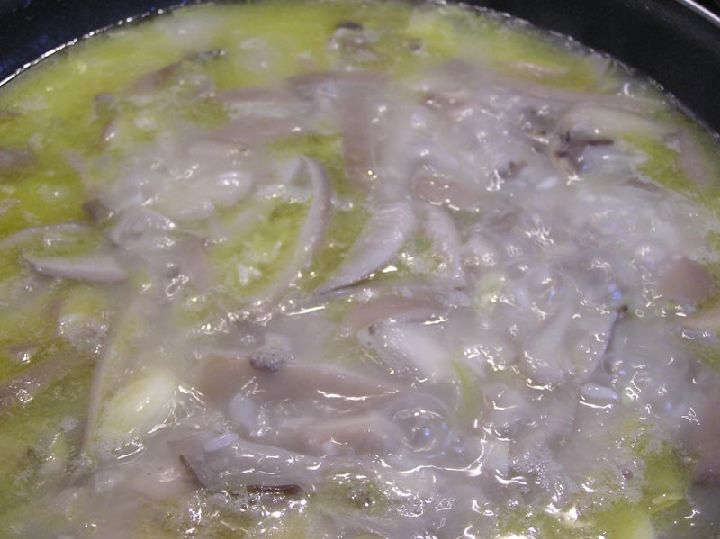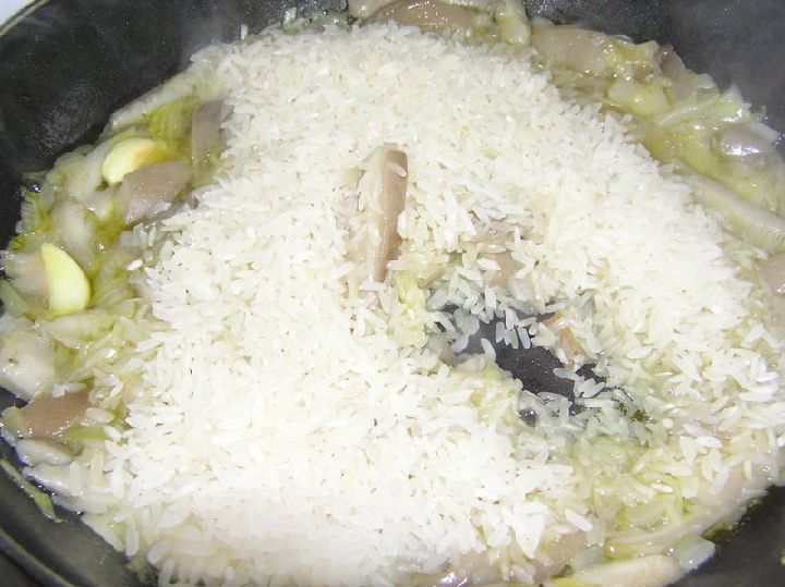 Seguidamente rehogamos en ese aceite el arroz y las setas. Podemos echar primero las setas y después el arroz pero si lo hacemos así esperaremos a que se evapore el agua que sueltan los hongos al cocinarse antes de añadir el arroz, es más práctico en todo caso añadir primero el arroz y cuando esté transparente agregar las setas.