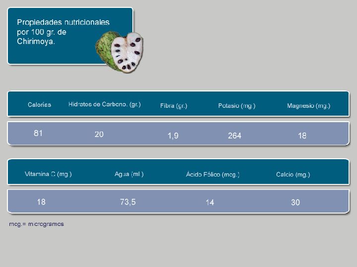 El componente mayoritario en la chirimoya es el agua, aunque aporta un alto valor calórico (debido al elevado índice de azúcares) y cantidades importantes de hidratos de carbono, como la glucosa o la fructosa.