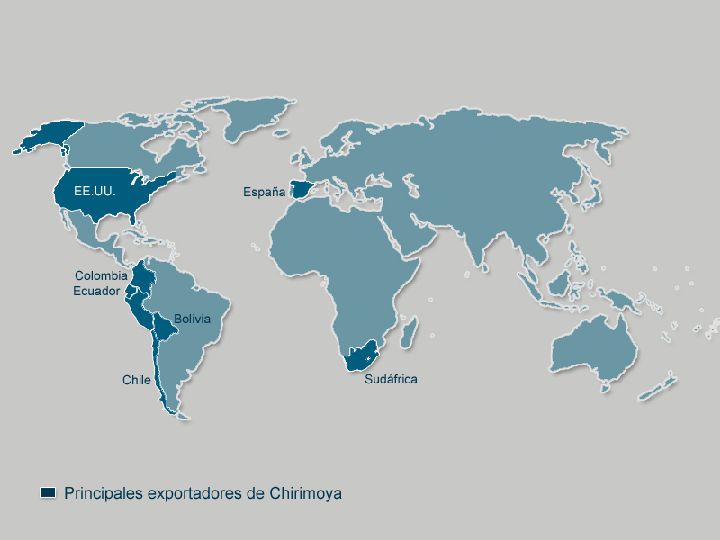 Otros países que también desarrollan el cultivo de la chirimoya con usos comerciales son Perú, Chile, Bolivia, Colombia y Ecuador en América del Sur, Estados Unidos en Norteamérica, así como Sudáfrica e Israel.