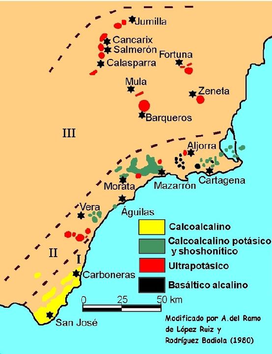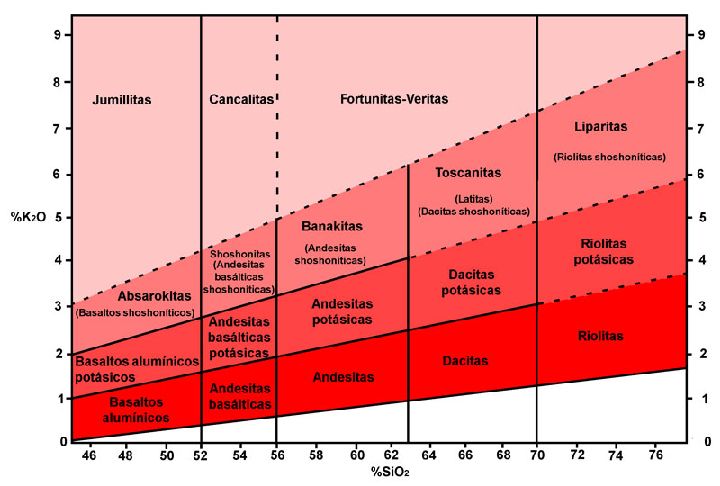 El análisis geoquímico y mineralógico de las rocas ha mostrado que la mayoría de ellas tienen un alto contenido en potasio, de ahí que la clasificación y nomenclatura de las rocas volcánicas de Murcia, y de todo el sureste español, se hace en base a sus contenidos en SiO2 y K2O (figura 1). Incluso tenemos una serie de rocas que se denominan lamproitas, que son ultrapotásicas y que debido al alto contenido en este elemento químico no se han podido clasificar con nombres clásicos de rocas volcánicas. Los geólogos las han dividido en cuatro tipos de rocas: jumillitas, cancalitas, fortunitas y veritas (figura 1). Este enriquecimiento se detecta a simple vista, pues es común que en las rocas ultrapotásicas haya grandes cristales de flogopita, una mica potásica.