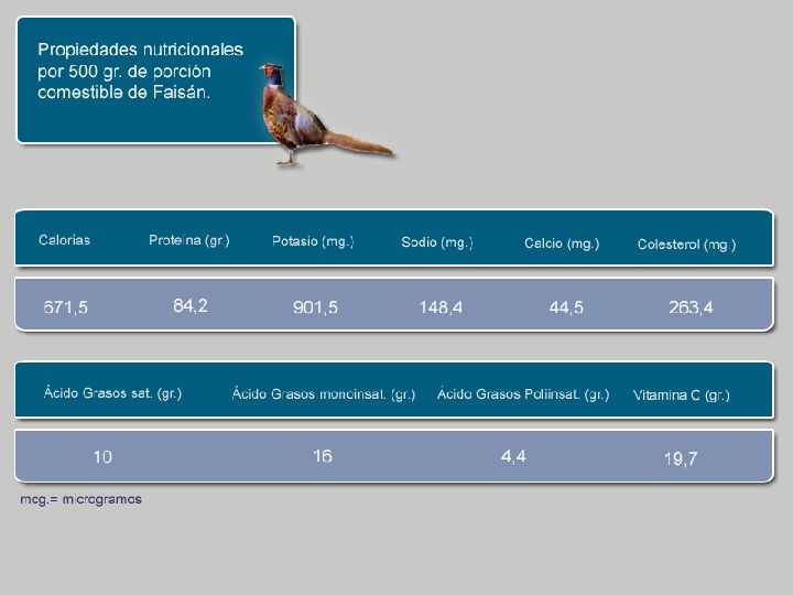 El faisán es un ave que aporta altos niveles de proteínas, con 133 calorías por cada 100 gramos de porción comestible, así como bajos índices de grasas y colesterol (aunque esta última característica puede verse modificada dependiendo de la técnica culinaria que se utilice para su elaboración). La mayor parte de la grasa se concentra en la piel (al igual que en el pato).