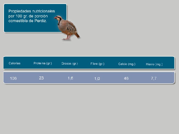 Las perdices son un alimento rico en proteínas, de alto valor biológico y con escaso contenido en grasas (la mayor parte incluida en su piel). Pero este último factor se puede ver modificado dependiendo del tipo de elaboración en la que se incluya su carne. Los ejemplares que se crían en libertad poseen aún menores niveles de grasas debido a su mayor movilidad.