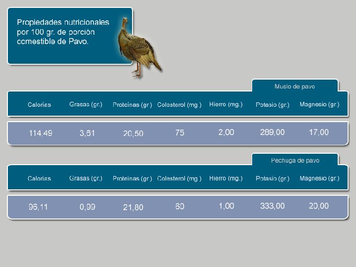 Como otras carnes de ave, posee un aporte de calorías menor, apenas 130 calorías por cada 100 gramos de porción comestible.