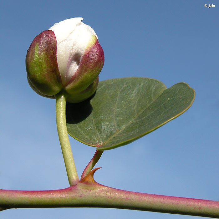 Arbusto erecto, de porte erguido, que puede alcanzar hasta 2 metros de altura. Tallos convertidos en troncos, relativamente gruesos, de 20 cm (o más) de diámetro, en los ejemplares más longevos, glabros, de ramas rectas, mayoritariamente rojizas-purpúreas, en ocasiones –las más viejas– azuladas y con frecuencia de cubierta cérea. Distancia entre nodos (parte del tallo donde se insertan las hojas) de 1 a 5 cm, con fuertes estípulas espinosas, muy curvadas hacia atrás, de hasta 6 mm de longitud, relativamente anchas en su base, anaranjadas. Hojas redondeadas, obcordadas, muy pocas veces ovadas, habitualmente algo carnosas, emarginadas, de extremo escotado, con mucrón vuelto hacia atrás. Botones florales con peciolo corto, de hasta 5 mm, lampiño (sin pelos), incluso los de desarrollo incipiente. Flores ligeramente zigomorfas (de simetría irregular), de peciolo largo, de hasta 5 cm, con dos verticilos de cuatro piezas, el sépalo inferior galeado (con forma de cuña), pétalos blancos con trazas rosas, y estambres muy numerosos, violáceos. Fruto oblongo de pedicelo largo (localmente –con frecuencia– llamado caparrón), pulpa amarilla y semillas marrones cuando están maduras, de aproximadamente 2 mm de diámetro.