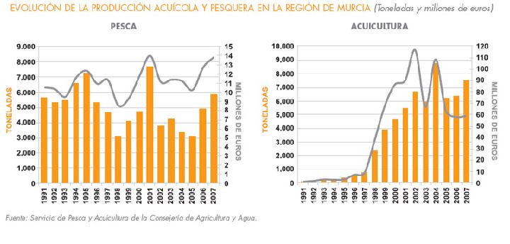 Sin embargo, la actividad más rentable del sector pesquero actual es la acuicultura, que ha vivido un desarrollo exponencial a partir de la década de los noventa con la crianza de especies como la dorada, lubina y el engorde de atún rojo. Según datos de la Consejería de Agricultura y Agua para el año 2007, la producción total de acuicultura en las costas murcianas fue de 7.475 toneladas que generaron alrededor de 60 millones de euros, siendo el atún rojo la especie más rentable, al reportar más de 35 millones de euros. Estas cifras demuestran su relevancia económica con relación a la pesca, cuadriplicando sus ingresos.