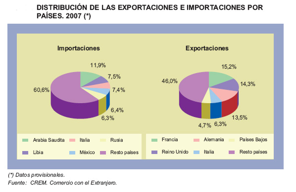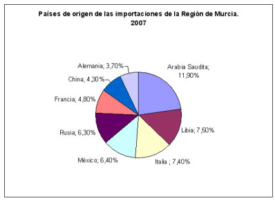 Durante el año 2007 las importaciones murcianas han experimentado un crecimiento del 3,96% con respecto a 2006 y han alcanzado los 8.860 millones de euros. Este incremento está especialmente protagonizado por la partida de "combustibles minerales y aceites minerales", cuyo peso sobre el total ronda casi el 60%, datos que revelan la elevada dependencia de los productos energéticos.